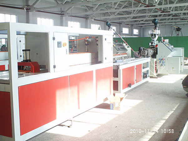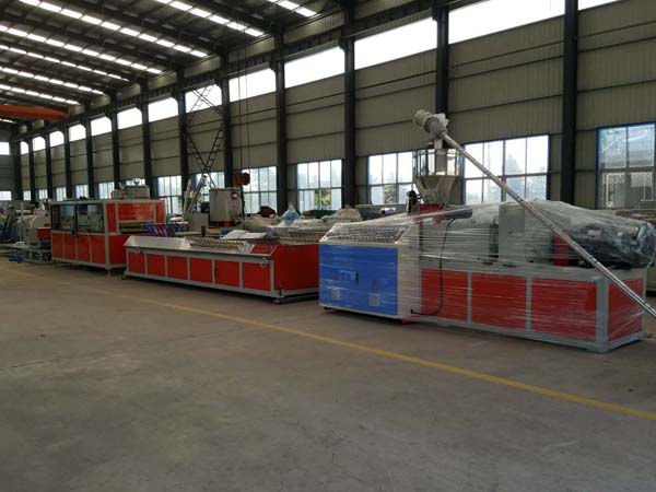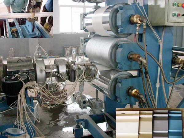 PVC異型材擠出生產(chǎn)線主要用于PVC門窗異型材,木塑型材,裝飾型材等產(chǎn)品,該機組有上料機,擠出機,中空定型臺,一體化牽引機切割機,貼膜機,翻料架組合,可以根據(jù)不同型材斷面及模具,選用不同規(guī)格的擠出機以適應產(chǎn)量的需要。真空定徑臺采用特殊加大漩渦流冷卻系統(tǒng),便于冷卻定型,特別的水平傾斜控制獨特的三維調(diào)整控制使得操作簡便得以更好體現(xiàn)。根據(jù)不同模具,定徑臺可選用4米,6米,8米,10米等規(guī)格,以滿足告訴擠出的要求。