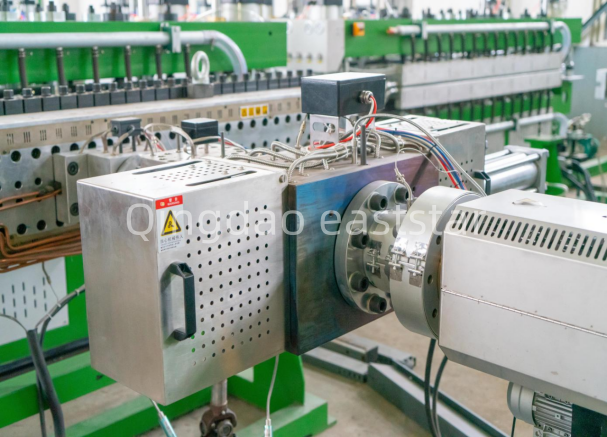 PP中空格子板生產(chǎn)線(xiàn)的核心擠出系統(tǒng)采用專(zhuān)用螺桿設(shè)計(jì),螺桿直徑120mm,長(zhǎng)徑比36:1,專(zhuān)門(mén)針對(duì)PP原料及回收料的高填充特性?xún)?yōu)化。擠出機(jī)配備132KW主電機(jī),通過(guò)英威騰變頻器實(shí)現(xiàn)精準(zhǔn)調(diào)速,最高轉(zhuǎn)速可達(dá)90rpm。